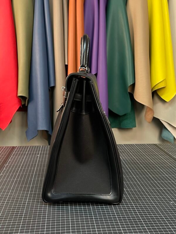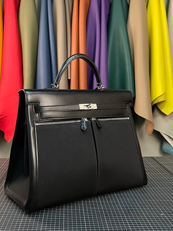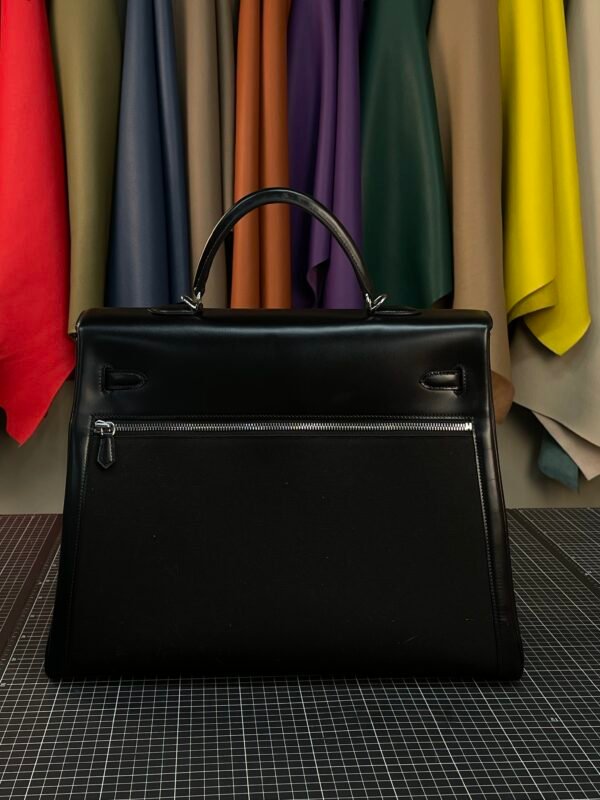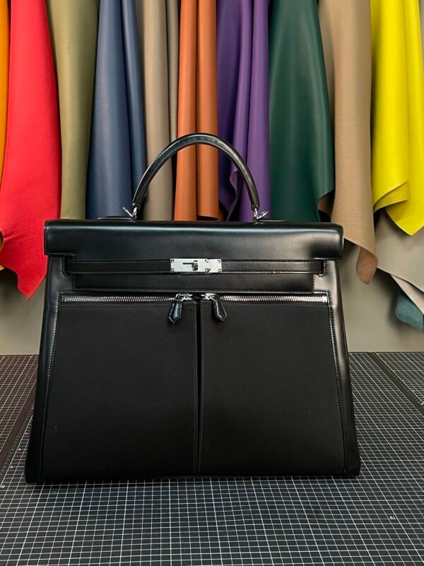 This Hermès Kelly Lakis 40 redefines the iconic Kelly silhouette with a focus on utility, crafted from a striking combination of polished Noir (Black) Box Calf leather and durable black canvas. The glossy leather frame and signature Kelly hardware contrast beautifully with the matte, rugged canvas body, creating a design that balances luxury with everyday practicality.